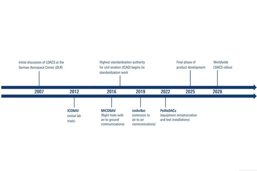 In the development of LDACS, four major research projects have played a key role. They are listed below the timeline and described more in detail in the info box further down in the article.